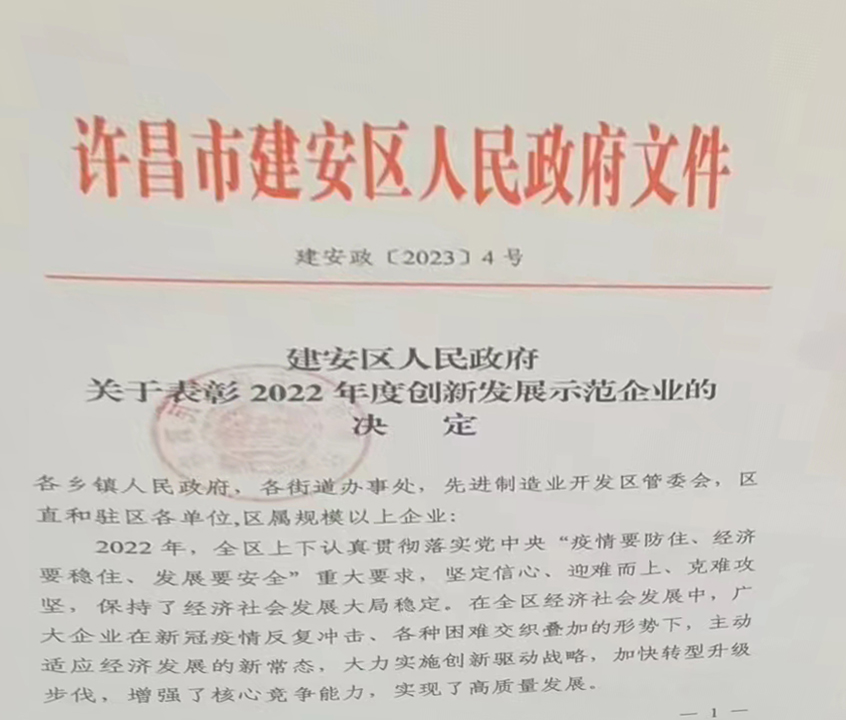 賀:我司被建安區(qū)政府選入2022年度創(chuàng)新發(fā)展示范企業(yè)