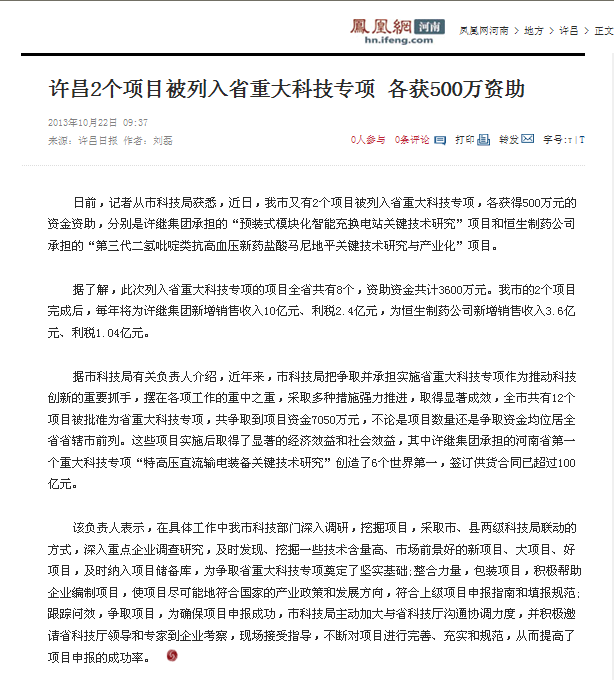 許昌恒生制藥有限公司的項(xiàng)目被列入省重大科技專(zhuān)項(xiàng)